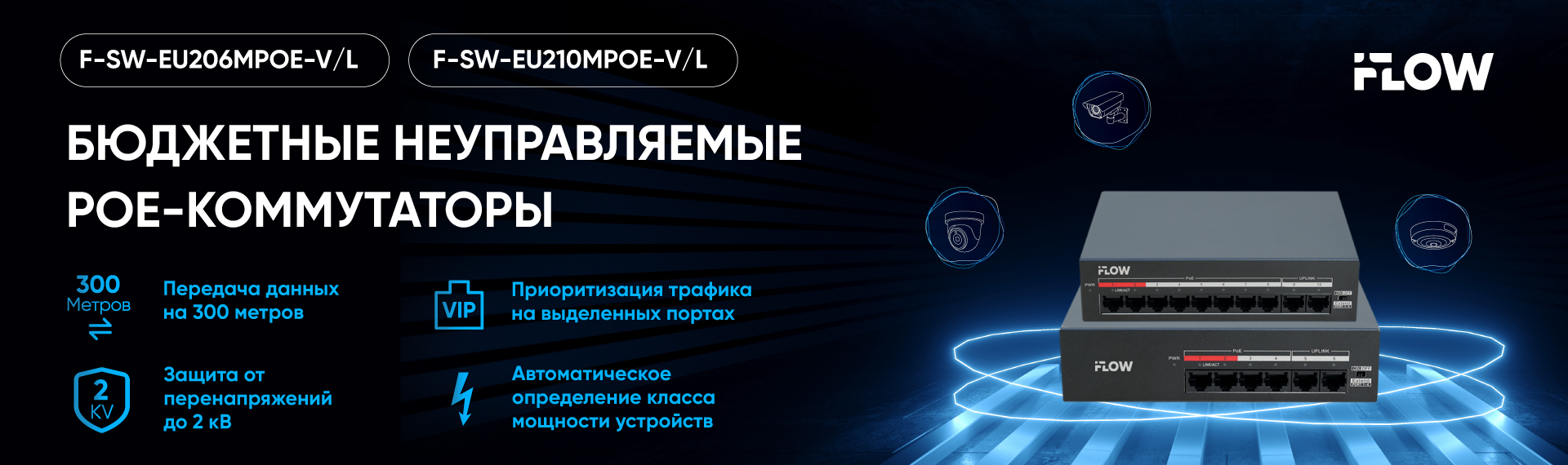 Именно для подобных задач разработаны неуправляемые PoE-коммутаторы iFLOW из линейки Lite: F-SW-EU206MPOE-V/L (на 4 PoE-порта) и F-SW-EU210MPOE-V/L (на 8 PoE-портов).