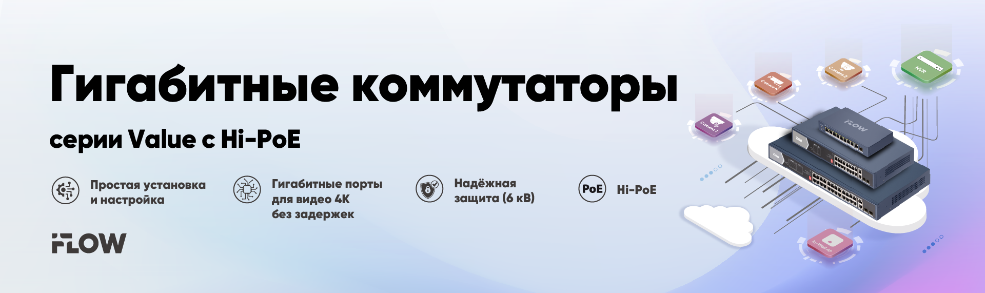 - Гарантия 3 года на все iFLOW Value: неуправляемые гигабитные коммутаторы с Hi-PoE.